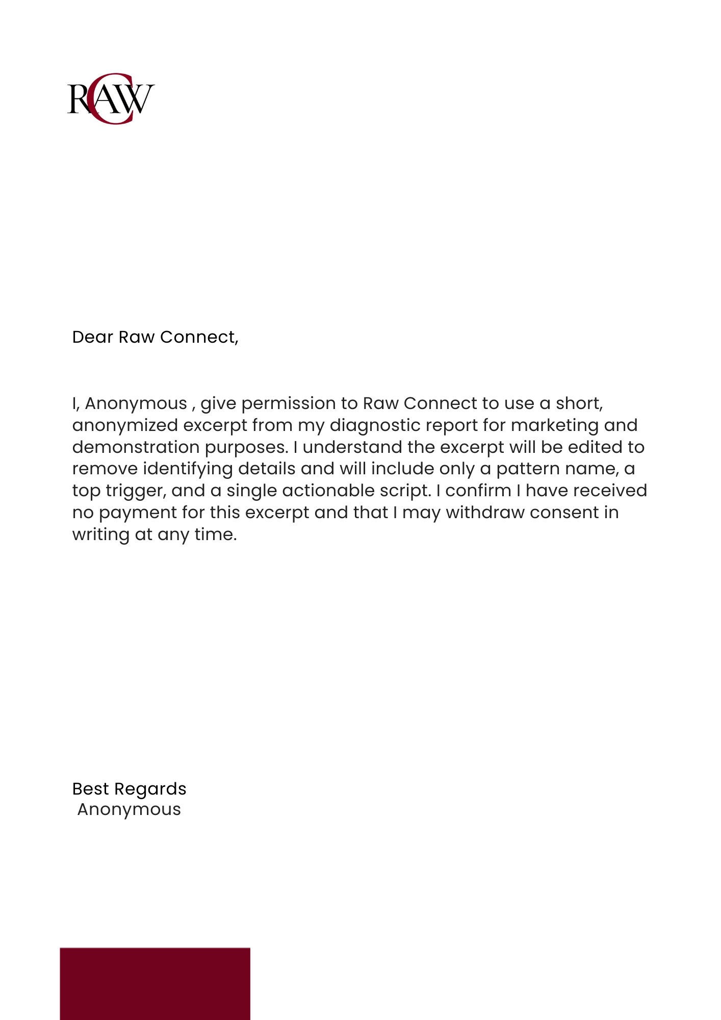 This is an anonymized excerpt from an actual Raw Connect Blueprint Report, shared with full written consent from the recipient. This represents approximately 15% of a complete report. This excerpt is provided for illustrative purposes only and may not be reproduced or distributed without permission.