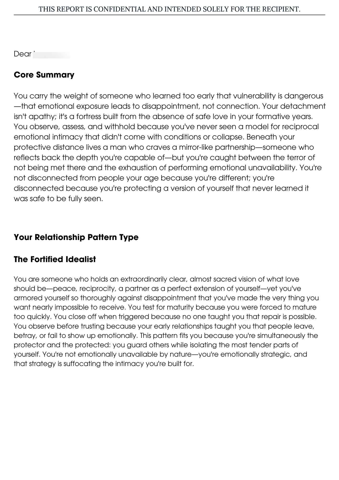 "I kept attracting the same emotionally unavailable type. The report showed me it wasn't bad luck my Performance Loop pattern was specifically choosing people I could 'earn' love from. Once I saw it, I couldn't unsee it. My next relationship was completely different."